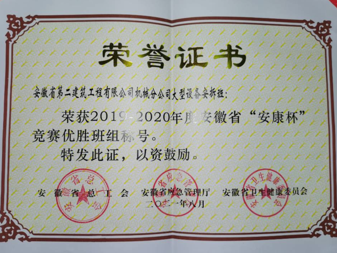 安徽二建公司機(jī)械分公司大型設(shè)備安拆班是一支負(fù)有戰(zhàn)斗力的班組,擔(dān)負(fù)全公司大型設(shè)備安拆維保任務(wù)。安拆班現(xiàn)有職工18人,包含4名黨員,4名入黨積極分子,主要負(fù)責(zé)大型設(shè)備的安拆、加節(jié)、維修保養(yǎng)及施工現(xiàn)場(chǎng)外電防護(hù)安裝作業(yè)等工作。多年來(lái),安拆班始終堅(jiān)持安全生產(chǎn)理念,開(kāi)展以“安全生產(chǎn)月”“安康杯”為重點(diǎn)的競(jìng)賽活動(dòng)。從細(xì)節(jié)入手,樹(shù)立零違章理念,堅(jiān)持教育和懲罰相結(jié)合,落實(shí)責(zé)任、夯實(shí)基礎(chǔ),避免不安全事件的發(fā)生。通過(guò)強(qiáng)化管理較好的完成各項(xiàng)指標(biāo),班組曾多次獲得建工集團(tuán)、公司“先進(jìn)集體”等多項(xiàng)榮譽(yù)稱號(hào),2019年,分公司被合肥市建筑工程協(xié)會(huì)評(píng)為“2018年度起重設(shè)備安全管理先進(jìn)企業(yè)”,次年,又被合肥市建筑工程協(xié)會(huì)評(píng)為“2019年度合肥市建筑業(yè)優(yōu)秀起重設(shè)備安裝工程專業(yè)承包企業(yè)”。2020年,分公司大型設(shè)備安拆班榮獲2019-2020年度安徽省“安康杯”競(jìng)賽優(yōu)勝班組稱號(hào),這份榮譽(yù)屬于公司,也屬于每一個(gè)奮勇投身特種設(shè)備安全的一線作業(yè)人員。