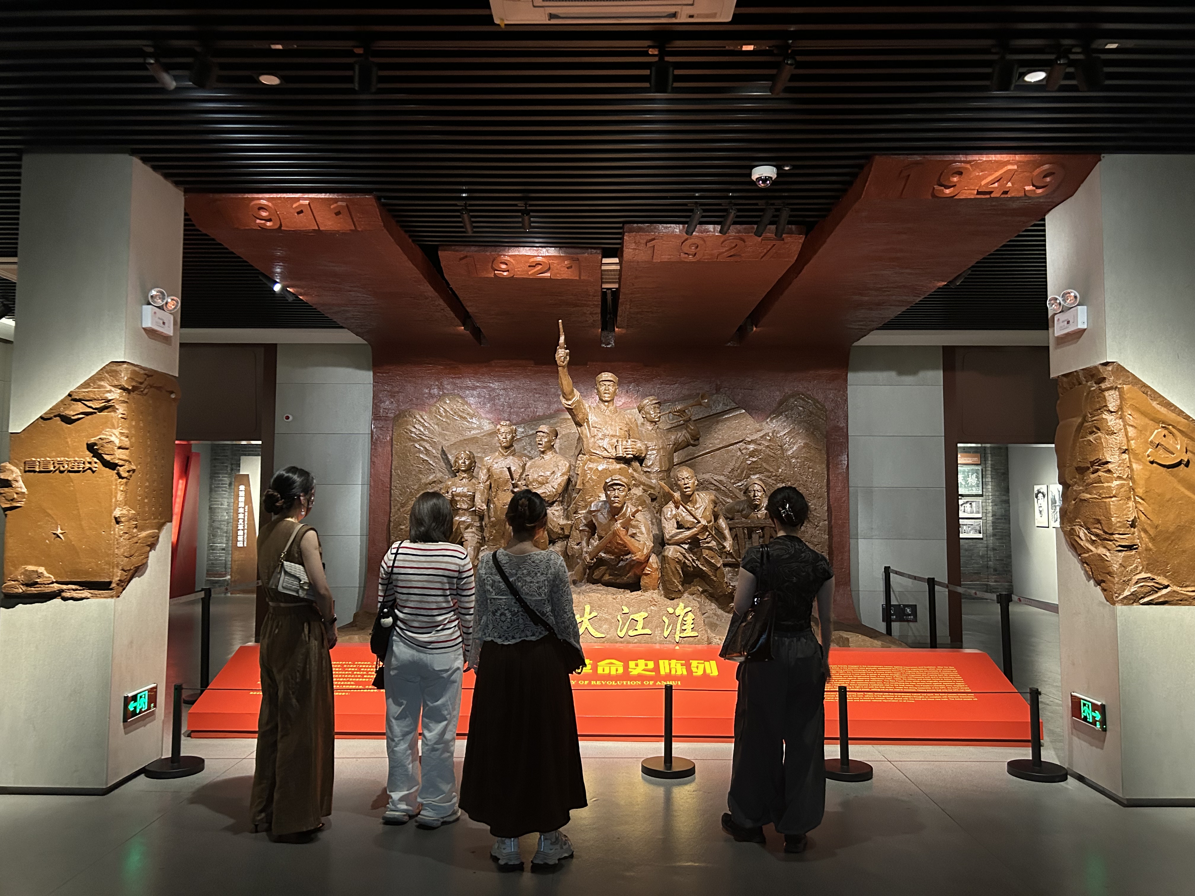 團(tuán)員青年來到安徽博物院,首先參觀“觀烽火江淮——安徽革命史陳列館”“安徽革命史陳列”分為“革命賡續(xù) 安徽建黨”“紅色沃土 紅軍搖籃”“華中砥柱 鐵軍戰(zhàn)歌”“江淮鏖兵 革命勝利”四個(gè)部分。展館以實(shí)物、歷史照片、多媒體等方式鮮活再現(xiàn)了自“五四運(yùn)動(dòng)”后安徽兒女的革命歷史。隨后,團(tuán)員青年們依次參觀了而今邁步從頭越——紀(jì)念毛澤東視察安徽省博物館六十周年、龍行中華——甲辰龍年生肖文物大聯(lián)展等展覽。