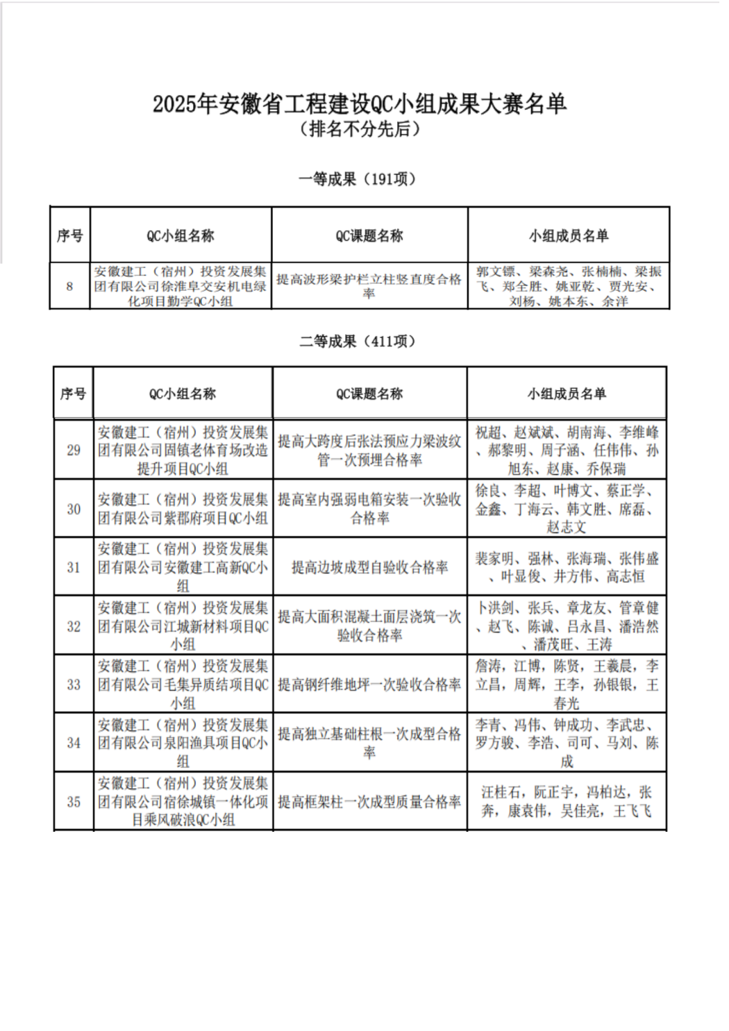 近日,安徽省建筑工程質(zhì)量與安全協(xié)會(huì)公布了2025年安徽省工程建設(shè)QC小組成果大賽獲獎(jiǎng)名單,宿州投發(fā)在本次大賽中脫穎而出,共獲得一等成果1項(xiàng)、二等成果7項(xiàng)、三等成果4項(xiàng)。此次獲評(píng)多個(gè)獎(jiǎng)項(xiàng),充分展現(xiàn)了公司在工程建設(shè)領(lǐng)域的創(chuàng)新實(shí)力以及技術(shù)水平。